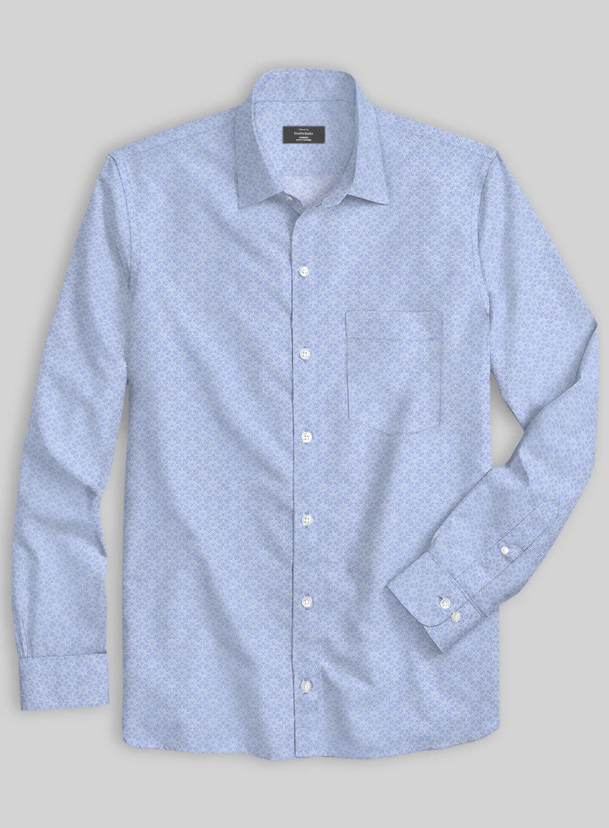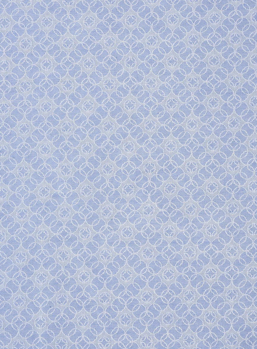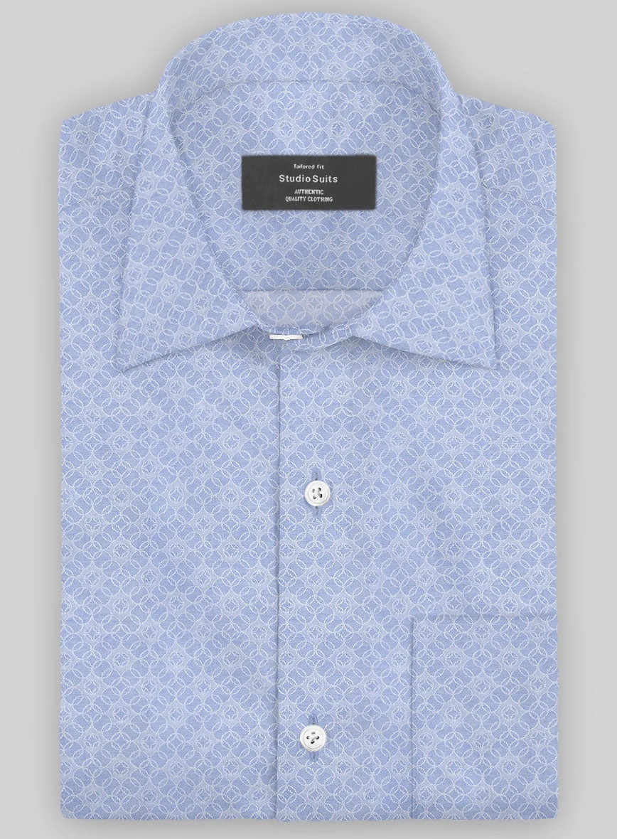 Elevate your style with our Italian Cotton Hexi Shirt, bringing a touch of luxury to your wardrobe. This shirt is crafted from pure cotton fabric, featuring an intricate pattern of blue and white with a geometric design of varied circular shapes. The light-blue hue exudes tranquility and sophistication, adding to its overall elegance.