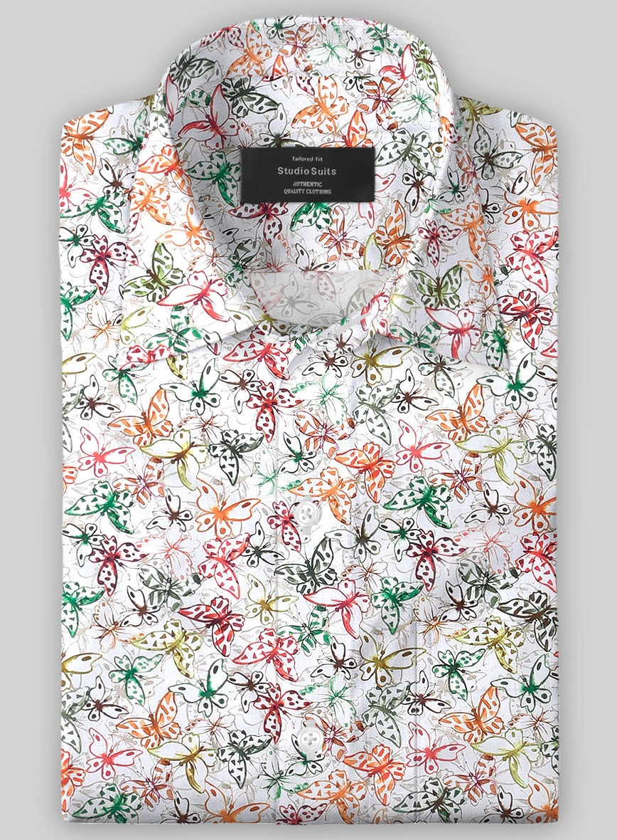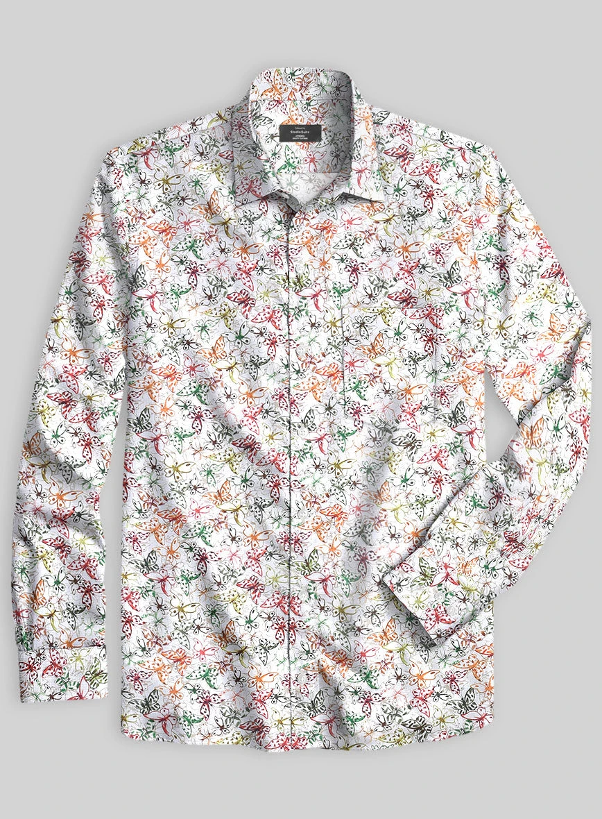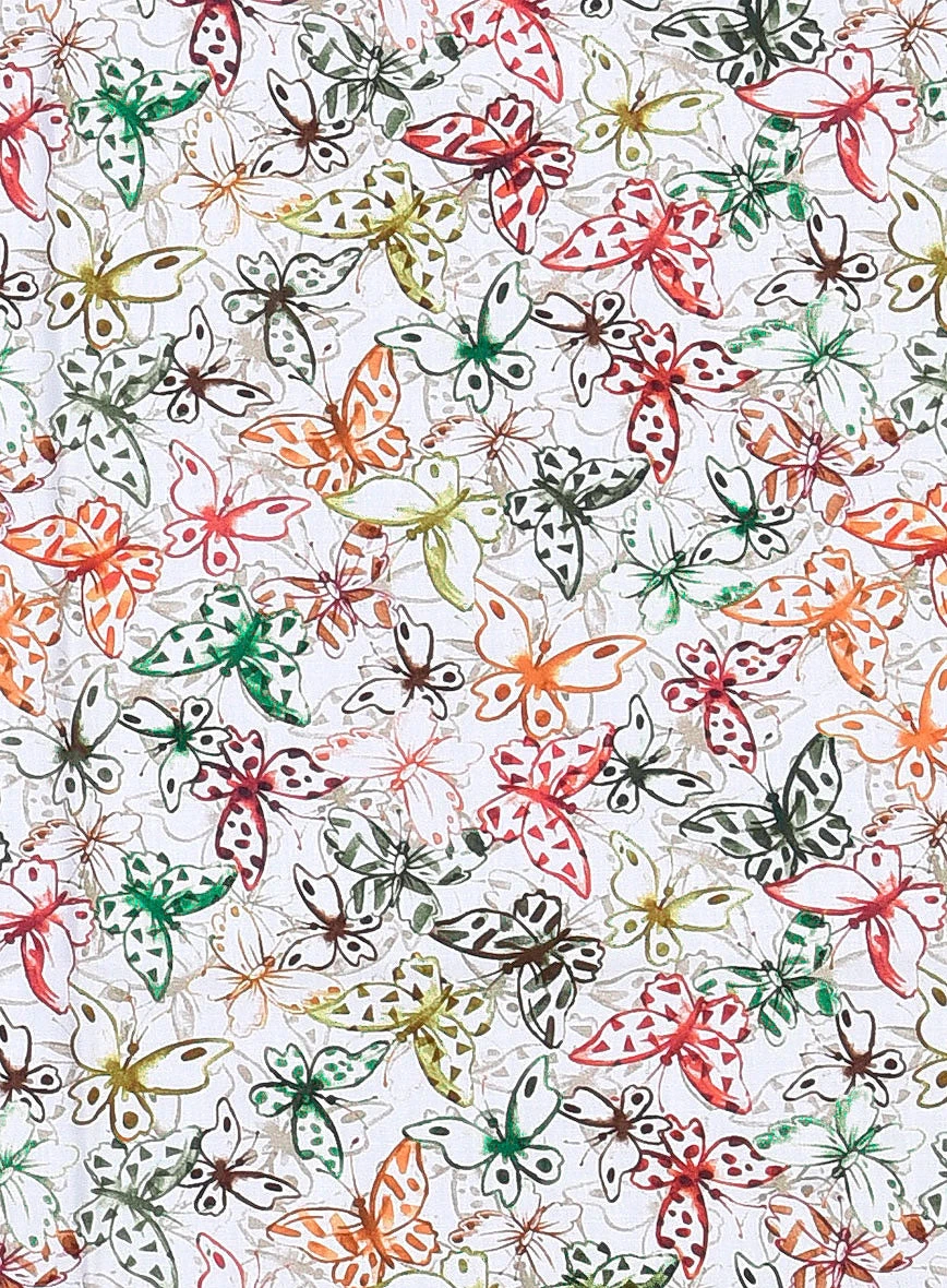 Summon the serene pleasures with the addition of our Italian Cotton Morpho Shirt. Besides, it is crafted from pure cotton cloth that exhibits a brisk, light and peacefully versatile tone with a multicolored butterfly pattern over a white shade.