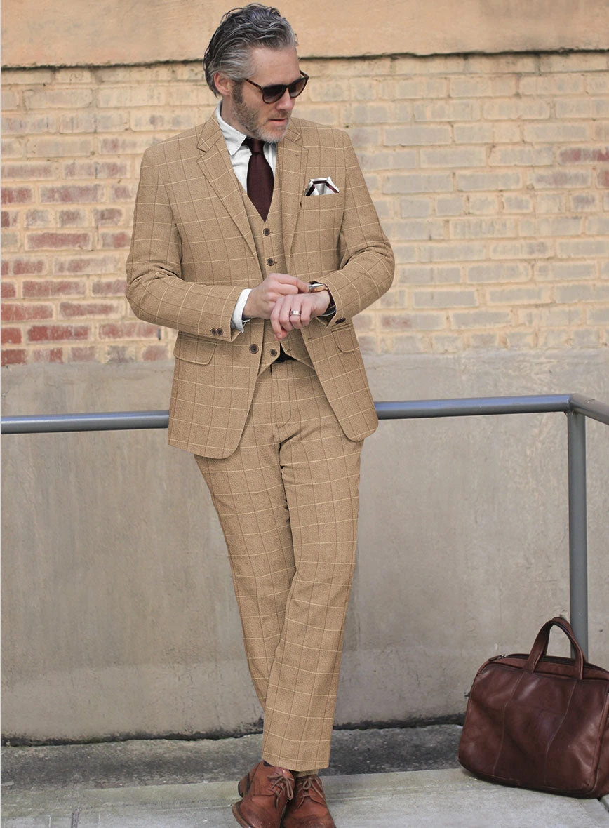 Look features a 2 button jacket with notch lapels, horn brown buttons, single vent, two cuff buttons and two welted back pockets on trousers.