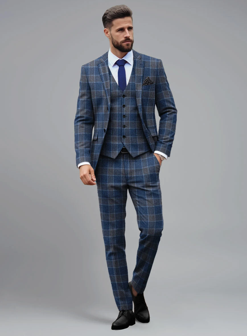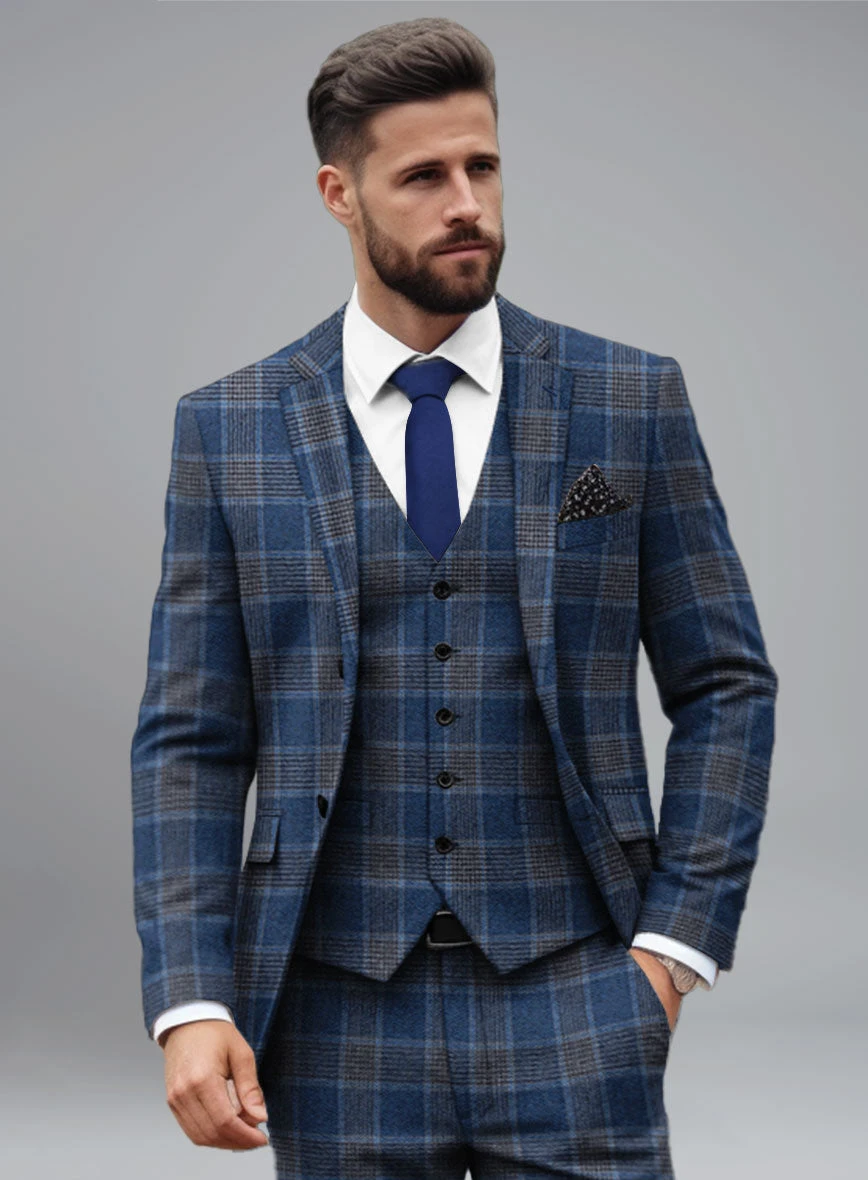 Infuse a touch of luxury into your wardrobe with our latest arrival: the Italian Vincenzo Check Tweed Suit. Crafted with a wool blend, it showcases a distinctive blue hue adorned with a striking black plaid pattern, embodying perfection in every stitch. The luxurious tweed fabric not only ensures unparalleled comfort but also guarantees a refined and distinguished appearance. Whether you’re attending a celebratory wedding or stepping into a crucial business meeting, this suit ensures you make a lasting impression wherever you go.