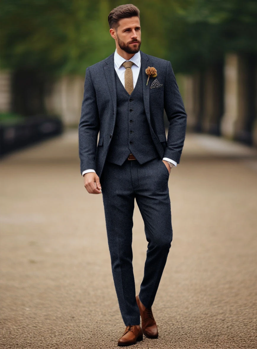 The versatile blue denim suit has everything you can wish for a subtle texture and an excellent drape. Crafted from wool, turn to the tweed suit when you want to look smart, whether for work or something more exciting. Combine it up with matching waistcoat, a white shirt and black polished shoes.